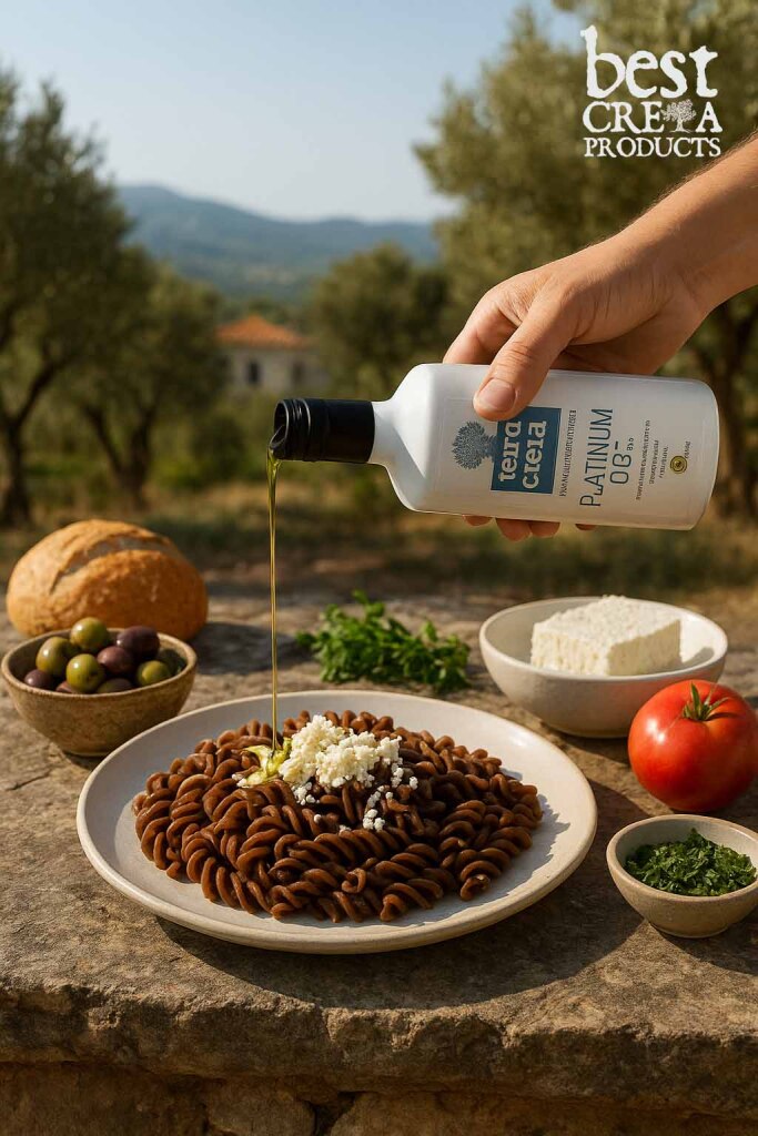 - Karobové cestoviny Fusilli s pár kvapkami olivového oleja Terra Creta – gurmánska harmónia Stredomoria.